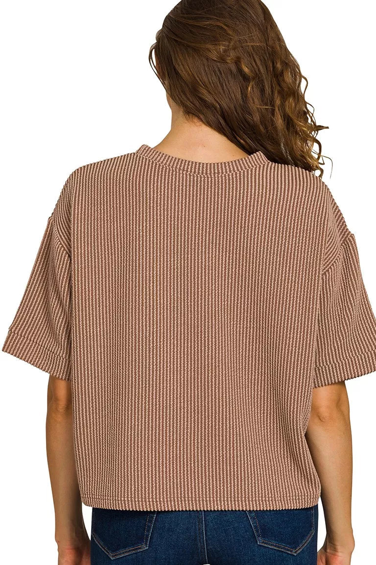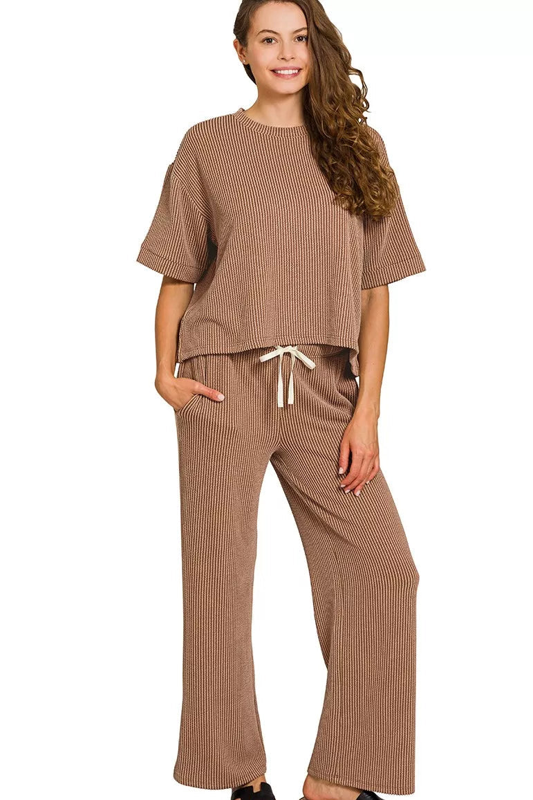 The Cocoa Ease Raised Rib Lounge Set is where cozy comfort meets modern chic. Designed with a textured raised rib finish, this two-piece set features a relaxed short-sleeve tee and matching drawstring pants with pockets for everyday practicality. The soft, slightly stretchy fabric blend ensures all-day wearability, while the coordinated silhouette makes it easy to look polished with minimal effort. Perfect for lounging, casual outings, or travel, this set offers the ultimate balance of style and ease. Style with slides and a denim jacket for a casual city stroll, or keep it simple with sandals for relaxed at-home chic.